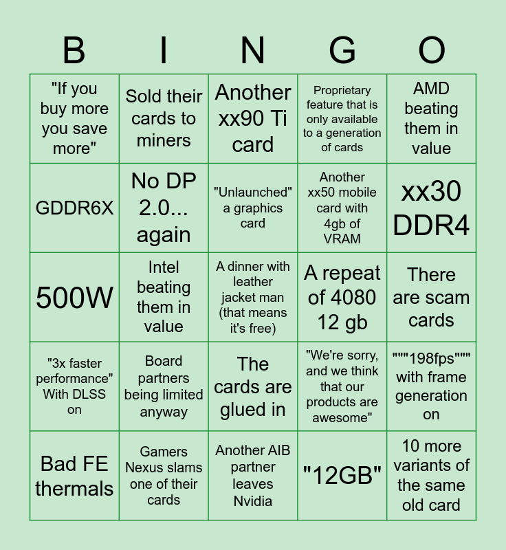 This bingo card has a free space and 24 words: Board partners being limited anyway, Gamers Nexus slams one of their cards, "Unlaunched" a graphics card, Bad FE thermals, AMD beating them in value, "If you buy more you save more", GDDR6X, Sold their cards to miners, A repeat of 4080 12 gb, The cards are glued in, Another xx50 mobile card with 4gb of VRAM, 500W, "We're sorry, and we think that our products are awesome", """198fps""" with frame generation on, No DP 2.0... again, "12GB", There are scam cards, Another xx90 Ti card, xx30 DDR4, Intel beating them in value, 10 more variants of the same old card, "3x faster performance" With DLSS on, Proprietary feature that is only available to a generation of cards and Another AIB partner leaves Nvidia.