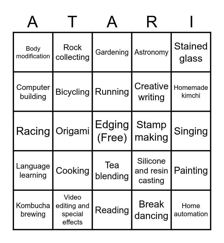 This bingo card has a free space and 57 words: Video games, Didjeridoo playing, Legos, Astronomy, Singing, Tabletop roleplaying games, Origami, Comic books, Creative writing, Weightlifting, Body modification, Board games, Furniture building, Painting, Ink illustration, Soap making, Gardening, Silicone and resin casting, Micro-electronics, Computer building, Video editing and special effects, Sewing, Break dancing, Stained glass, Skydiving, Cooking, Mechanical keyboards, Coffee brewing, Homemade kimchi, Kombucha brewing, Bread baking, Home improvement, Trumpet playing, Hat collecting, Racing, Bicycling, Computer programming, Stamp making, Home automation, Language learning, Rock collecting, Reading, Wood working, Yoga, Hiking, Card games, Running, Dancing, Cosplay, Anime, Data storage, Tea blending, Memes, AI storytelling, Taekwondo, Karaoke and Cake decoration.