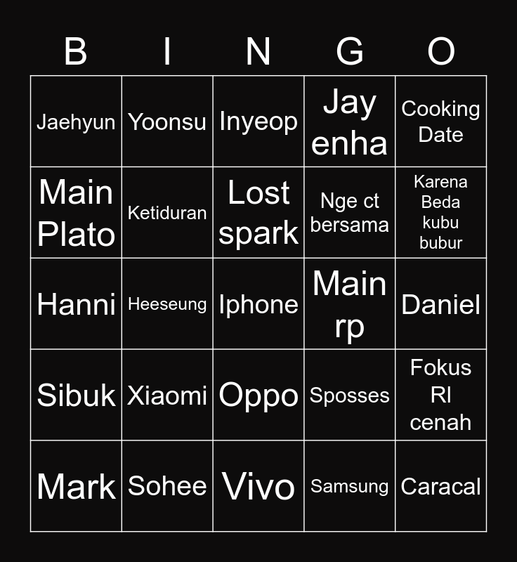 This bingo card has a free space and 24 words: Xiaomi, Sohee, Lost spark, Mark, Cooking Date, Jaehyun, Main Plato, Yoonsu, Main rp, Oppo, Nge ct bersama, Hanni, Sposses, Fokus Rl cenah, Ketiduran, Samsung, Daniel, Inyeop, Karena Beda kubu bubur, Heeseung, Caracal, Sibuk, Jay enha and Vivo.