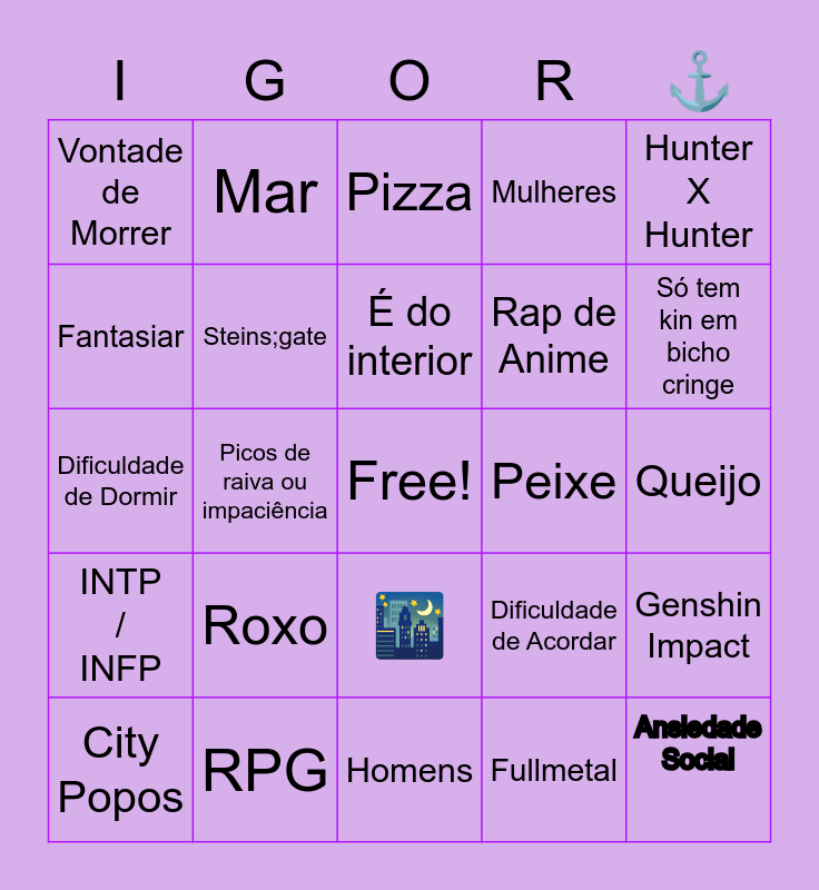This bingo card has a free space and 24 words: City Popos, Roxo, É do interior, Fullmetal, Hunter X Hunter, Vontade de Morrer, Mar, Pizza, Peixe, Queijo, Dificuldade de Dormir, Steins;gate, Dificuldade de Acordar, Genshin Impact, Fantasiar, RPG, Homens, Mulheres, Só tem kin em bicho cringe, INTP / INFP, Picos de raiva ou impaciência, 🌃, Rap de Anime and Ansiedade Social.