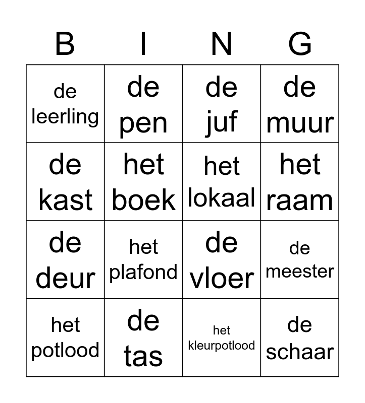 This bingo card has 16 words: de tas, de meester, de juf, de leerling, de deur, de pen, de vloer, het kleurpotlood, de kast, het boek, het potlood, de muur, het plafond, het raam, het lokaal and de schaar.