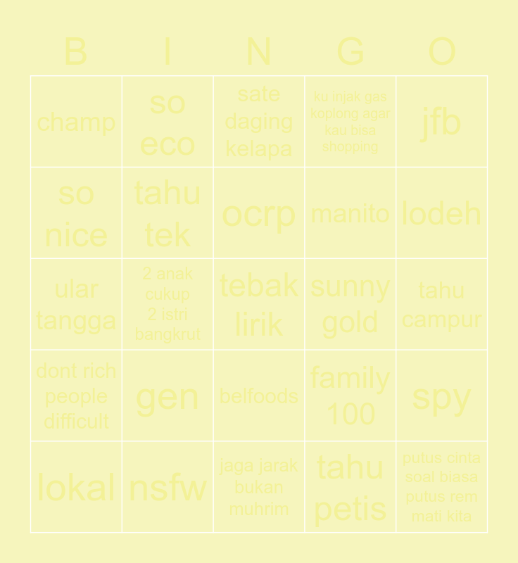 This bingo card has a free space and 24 words: gen, nsfw, ocrp, lokal, jfb, champ, so nice, so eco, sunny gold, belfoods, manito, ular tangga, family 100, spy, tahu tek, tahu petis, tahu campur, sate daging kelapa, lodeh, 2 anak cukup 2 istri bangkrut, putus cinta soal biasa putus rem mati kita, dont rich people difficult, ku injak gas koplong agar kau bisa shopping and jaga jarak bukan muhrim.