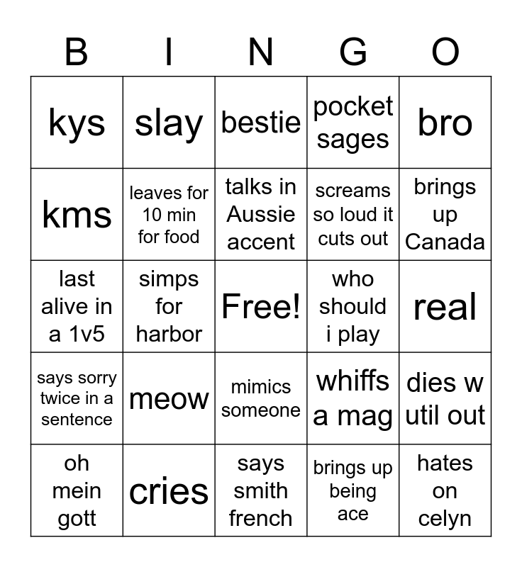 This bingo card has a free space and 24 words: meow, cries, talks in Aussie accent, oh mein gott, bro, kys, kms, slay, who should i play, mimics someone, screams so loud it cuts out, last alive in a 1v5, whiffs a mag, dies w util out, leaves for 10 min for food, brings up being ace, real, bestie, brings up Canada, simps for harbor, hates on celyn, says sorry twice in a sentence, pocket sages and says smith french.