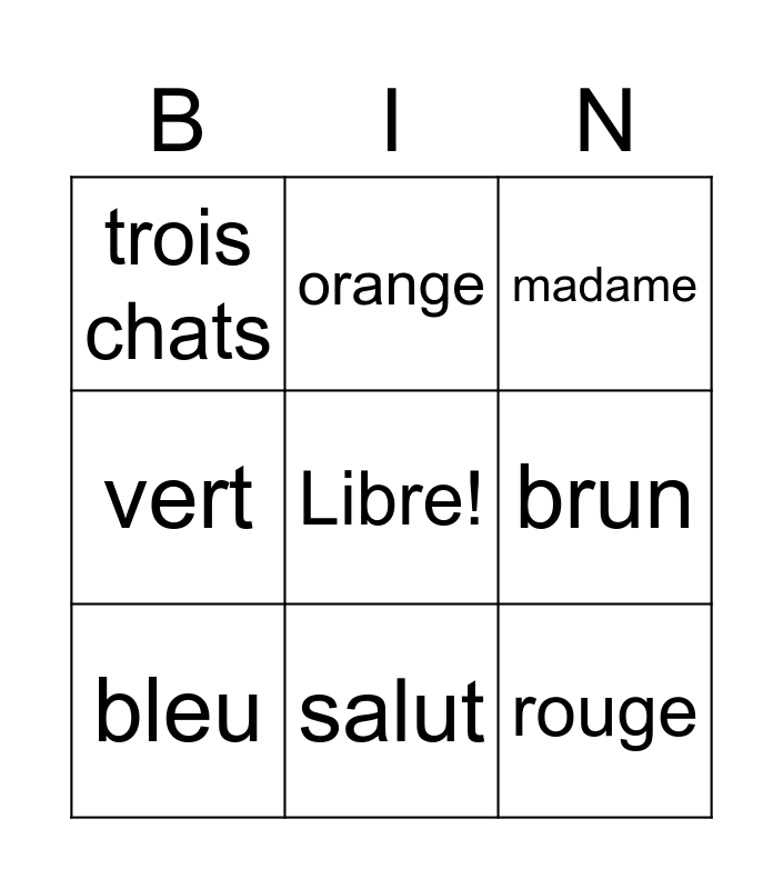 This bingo card has a free space and 32 words: chien, deux, chat, un, deux, bleu, rouge, rose, orange, bonjour, salut, madame, merci, cochon, Suisse, France, Canada, Ça va?, au revoir, jaune, trois, sept, dix, neuf, quatre, vert, noir, brun, trois chats, deux chiens, dix cochons and un chien brun.