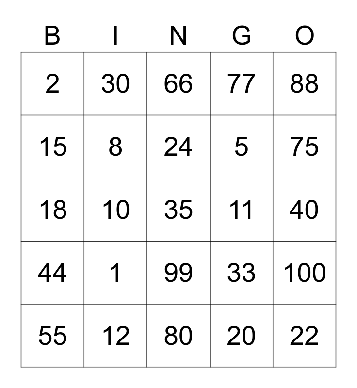 This bingo card has a free space and 24 words: 1, 12, 24, 55, 88, 2, 15, 30, 11, 99, 5, 18, 33, 100, 8, 20, 40, 66, 75, 10, 22, 44, 77 and 80.