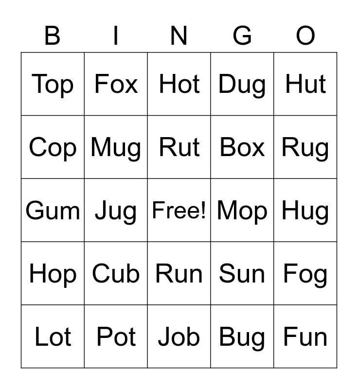 This bingo card has a free space and 24 words: Cub, Pot, Rut, Lot, Hut, Top, Cop, Fox, Mop, Run, Box, Gum, Sun, Fog, Mug, Bug, Hug, Hot, Rug, Jug, Fun, Hop, Dug and Job.