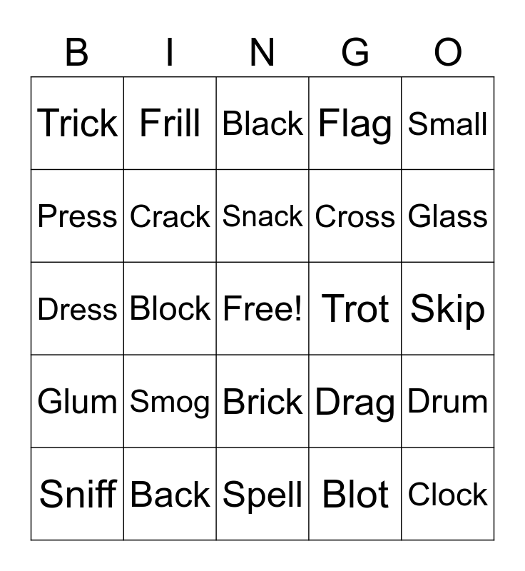 This bingo card has a free space and 25 words: Smog, Spell, Snack, Sniff, Small, Trick, Press, Frill, Trot, Brick, Cross, Dress, Drag, Drum, Crack, Plum, Skip, Black, Glass, Block, Clock, Back, Glum, Flag and Blot.