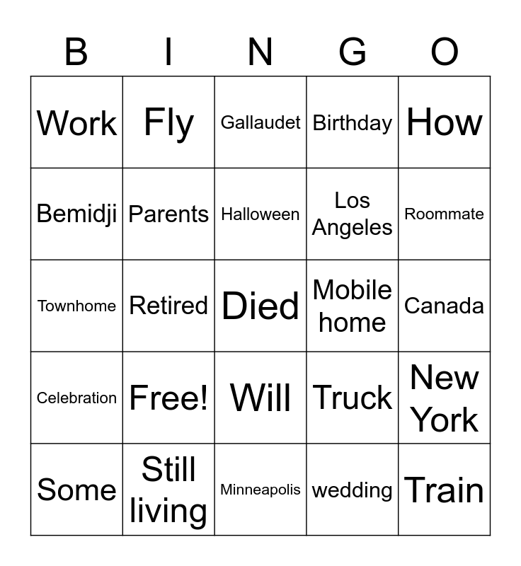 This bingo card has 25 words: Free!, Minneapolis, Halloween, Some, How, Work, Bemidji, Fly, Mobile home, Will, Los Angeles, Townhome, Truck, New York, Parents, Train, Canada, Gallaudet, Roommate, Retired, Died, Still living, Celebration, Birthday and wedding.