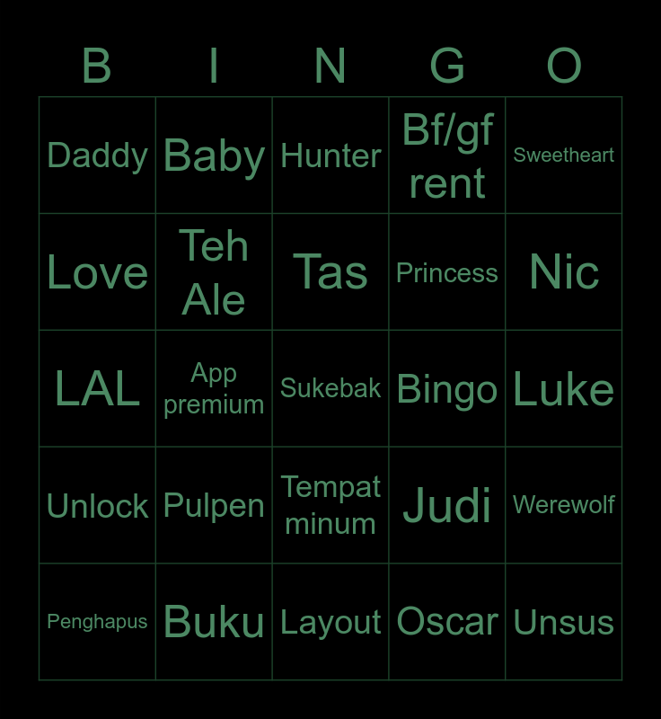This bingo card has a free space and 24 words: Pulpen, Buku, Tas, Penghapus, Sweetheart, Daddy, Love, Baby, Bingo, Tempat minum, Princess, LAL, Judi, Werewolf, Teh Ale, Oscar, Luke, Hunter, Nic, App premium, Unsus, Unlock, Bf/gf rent and Layout.