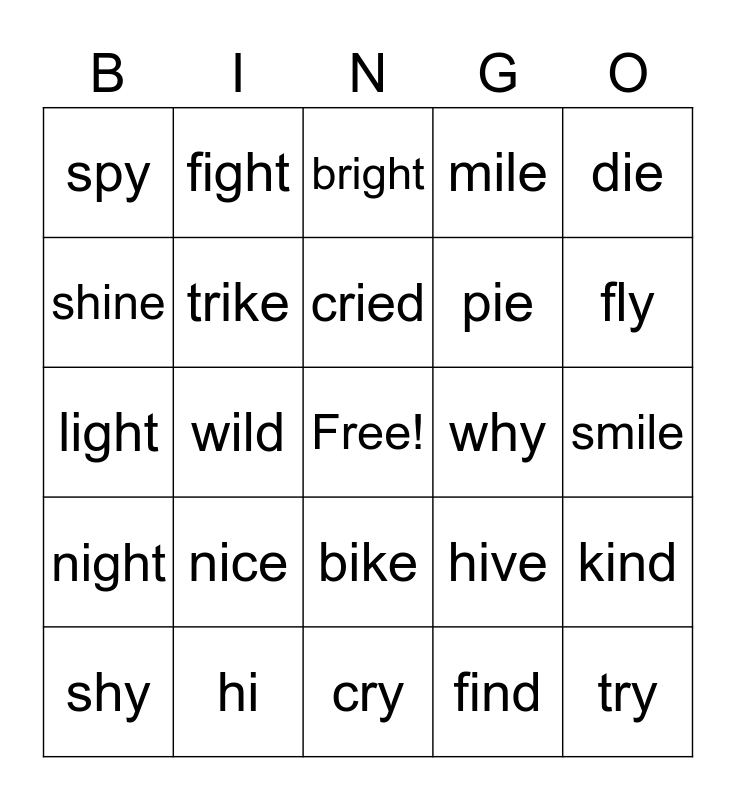 This bingo card has a free space and 24 words: nice, hi, cried, shy, die, spy, shine, fight, why, bike, pie, light, hive, kind, trike, find, smile, bright, fly, wild, try, night, mile and cry.