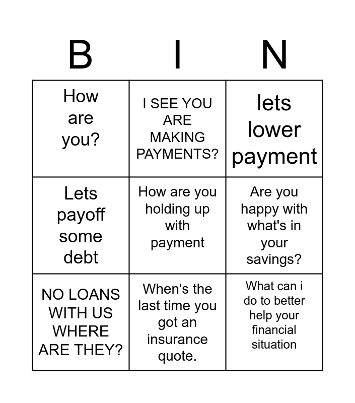 This bingo card has 9 words: NO LOANS WITH US WHERE ARE THEY?, lets lower payment, I SEE YOU ARE MAKING PAYMENTS?, Lets payoff some debt, How are you?, Are you happy with what's in your savings?, How are you holding up with payment, What can i do to better help your financial situation and When's the last time you got an insurance quote..