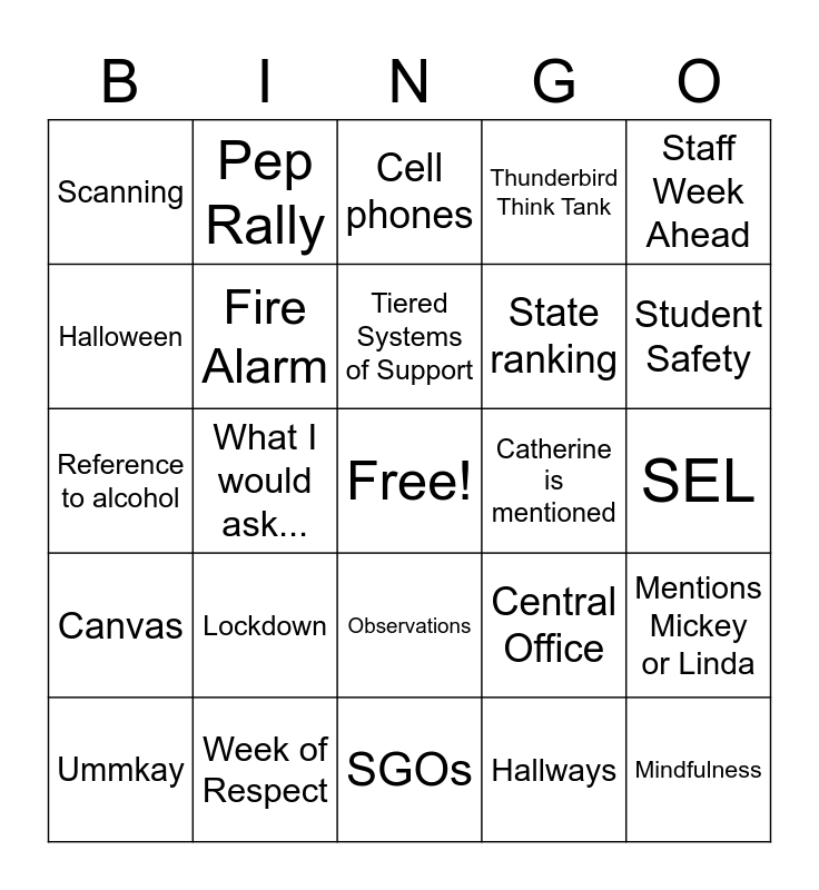 This bingo card has a free space and 29 words: Ummkay, Building Bridges, What I would ask..., Bathrooms, Scanning, Cell phones, Fire Alarm, Lockdown, Catherine is mentioned, Week of Respect, SEL, Mindfulness, SGOs, Hallways, Student Safety, Thank you, Observations, Canvas, Staff Week Ahead, Reference to alcohol, Central Office, Reference to family, State ranking, Halloween, Thunderbird Think Tank, Pep Rally, Mentions Mickey or Linda, Tiered Systems of Support and Someone is made cohost.