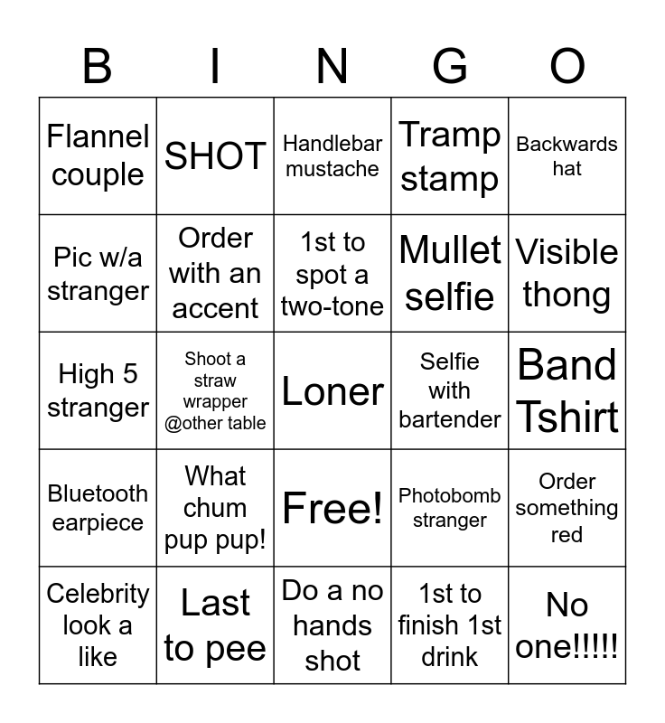 This bingo card has 26 words: Free!, 1st to finish 1st drink, 1st to spot a two-tone, Last to pee, Backwards hat, Flannel couple, Pic w/a stranger, SHOT, Band Tshirt, Photobomb stranger, Mullet selfie, High 5 stranger, Order something red, Celebrity look a like, Shoot a straw wrapper @other table, Seasonal themed drink, Tramp stamp, Bluetooth earpiece, Handlebar mustache, Loner, Visible thong, Do a no hands shot, Selfie with bartender, What chum pup pup!, Order with an accent and No one!!!!!.