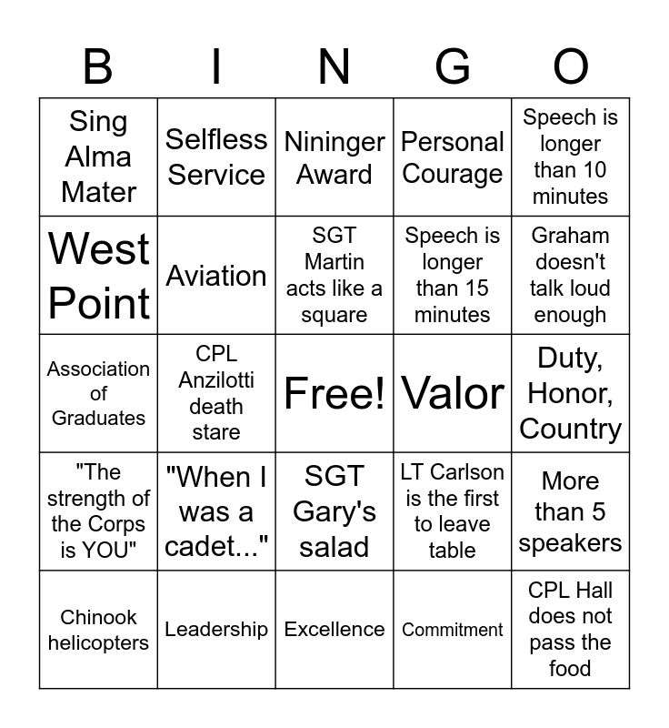 This bingo card has a free space and 24 words: "When I was a cadet...", Leadership, SGT Martin acts like a square, Chinook helicopters, Speech is longer than 10 minutes, Sing Alma Mater, West Point, Selfless Service, Valor, SGT Gary's salad, Speech is longer than 15 minutes, Association of Graduates, LT Carlson is the first to leave table, More than 5 speakers, Aviation, Commitment, Duty, Honor, Country, Nininger Award, Graham doesn't talk loud enough, CPL Anzilotti death stare, CPL Hall does not pass the food, "The strength of the Corps is YOU", Personal Courage and Excellence.