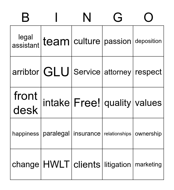 This bingo card has a free space and 24 words: paralegal, HWLT, Service, change, deposition, legal assistant, arribtor, team, quality, insurance, attorney, front desk, relationships, ownership, GLU, litigation, values, culture, respect, intake, marketing, happiness, passion and clients.