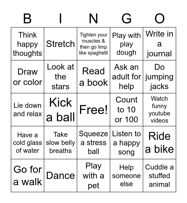 This bingo card has a free space and 24 words: Take slow belly breaths, Dance, Read a book, Go for a walk, Write in a journal, Think happy thoughts, Draw or color, Stretch, Count to 10 or 100, Squeeze a stress ball, Ask an adult for help, Lie down and relax, Listen to a happy song, Ride a bike, Look at the stars, Help someone else, Watch funny youtube videos, Tighten your muscles & then go limp like spaghetti, Do jumping jacks, Kick a ball, Cuddle a stuffed animal, Have a cold glass of water, Play with play dough and Play with a pet.