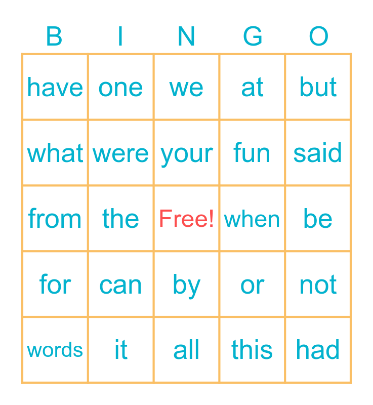 This bingo card has a free space and 24 words: can, it, your, words, but, have, what, one, when, by, fun, from, or, not, were, this, be, we, said, the, had, for, at and all.