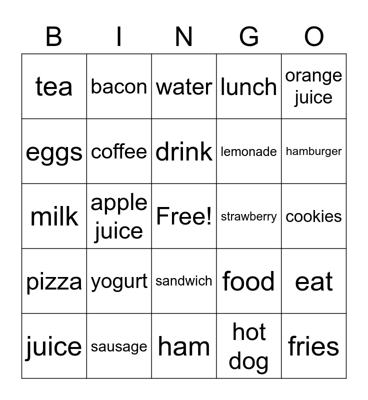 This bingo card has a free space and 24 words: yogurt, sausage, drink, juice, orange juice, tea, eggs, bacon, strawberry, sandwich, lemonade, milk, food, eat, coffee, hot dog, cookies, water, hamburger, apple juice, fries, pizza, lunch and ham.