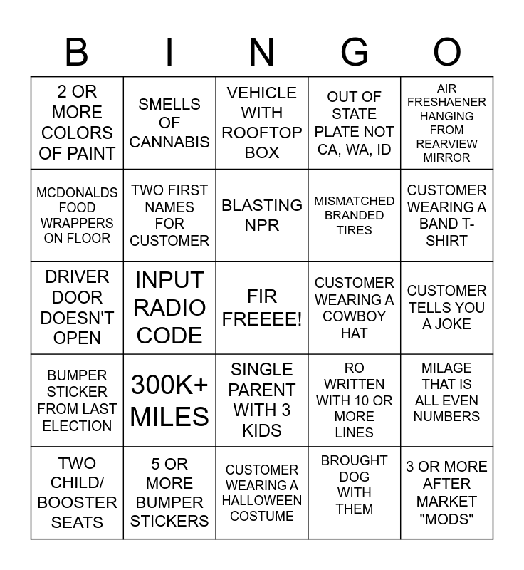 This bingo card has a free space and 24 words: 300K+ MILES, 5 OR MORE BUMPER STICKERS, BLASTING NPR, TWO CHILD/ BOOSTER SEATS, AIR FRESHAENER HANGING FROM REARVIEW MIRROR, 2 OR MORE COLORS OF PAINT, MCDONALDS FOOD WRAPPERS ON FLOOR, SMELLS OF CANNABIS, CUSTOMER WEARING A COWBOY HAT, SINGLE PARENT WITH 3 KIDS, MISMATCHED BRANDED TIRES, DRIVER DOOR DOESN'T OPEN, RO WRITTEN WITH 10 OR MORE LINES, MILAGE THAT IS ALL EVEN NUMBERS, TWO FIRST NAMES FOR CUSTOMER, BROUGHT DOG WITH THEM, CUSTOMER TELLS YOU A JOKE, VEHICLE WITH ROOFTOP BOX, CUSTOMER WEARING A BAND T-SHIRT, INPUT RADIO CODE, 3 OR MORE AFTER MARKET "MODS", BUMPER STICKER FROM LAST ELECTION, OUT OF STATE PLATE NOT CA, WA, ID and CUSTOMER WEARING A HALLOWEEN COSTUME.