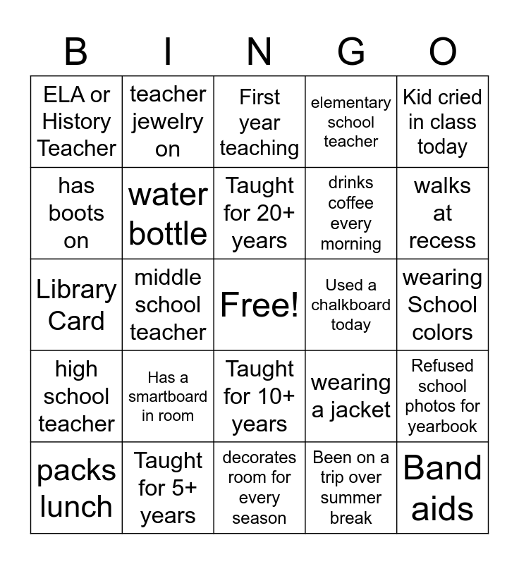 This bingo card has a free space and 41 words: pencil, Library Card, school ID, water bottle, Taught for 5+ years, Taught for 10+ years, Taught for 20+ years, Taught for 30+ years, Kid cried in class today, high school teacher, middle school teacher, elementary school teacher, Band aids, wearing School colors, Used a chalkboard today, Has a smartboard in room, Math or Science Teacher, ELA or History Teacher, Related Arts Teacher, First year teaching, Refused school photos for yearbook, Coaches a sport, decorates room for every season, drinks coffee every morning, has a class pet, wears glasses on top of head, Been on a trip over summer break, Has hand sanitizer with them, walks at recess, reading glasses, wears contacts, teacher jewelry on, packs lunch, marker, wearing a jacket, has boots on, has worn a costume to work, kids artwork up in classroom, 1st TNO, has a wrist watch (not smart watch) and up in classroom.
