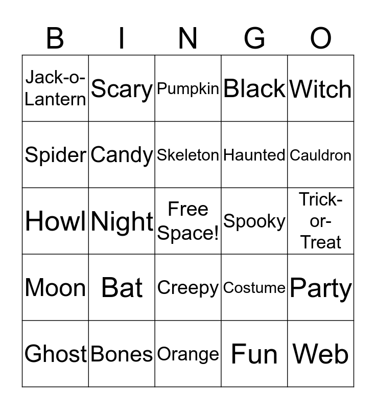 This bingo card has a free space and 24 words: Bat, Bones, Skeleton, Ghost, Witch, Jack-o-Lantern, Spider, Scary, Spooky, Creepy, Haunted, Howl, Costume, Party, Candy, Fun, Trick-or-Treat, Pumpkin, Cauldron, Night, Web, Moon, Black and Orange.