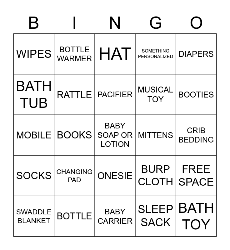 This bingo card has 26 words: ONESIE, SLEEP SACK, PACIFIER, BOTTLE, DIAPERS, WIPES, BATH TUB, BOTTLE WARMER, CRIB BEDDING, BURP CLOTH, MUSICAL TOY, MOBILE, FREE SPACE, SWADDLE BLANKET, BOOKS, SWING, SOMETHING PERSONALIZED, SOCKS, HAT, BABY SOAP OR LOTION, BOOTIES, BABY CARRIER, MITTENS, CHANGING PAD, RATTLE and BATH TOY.