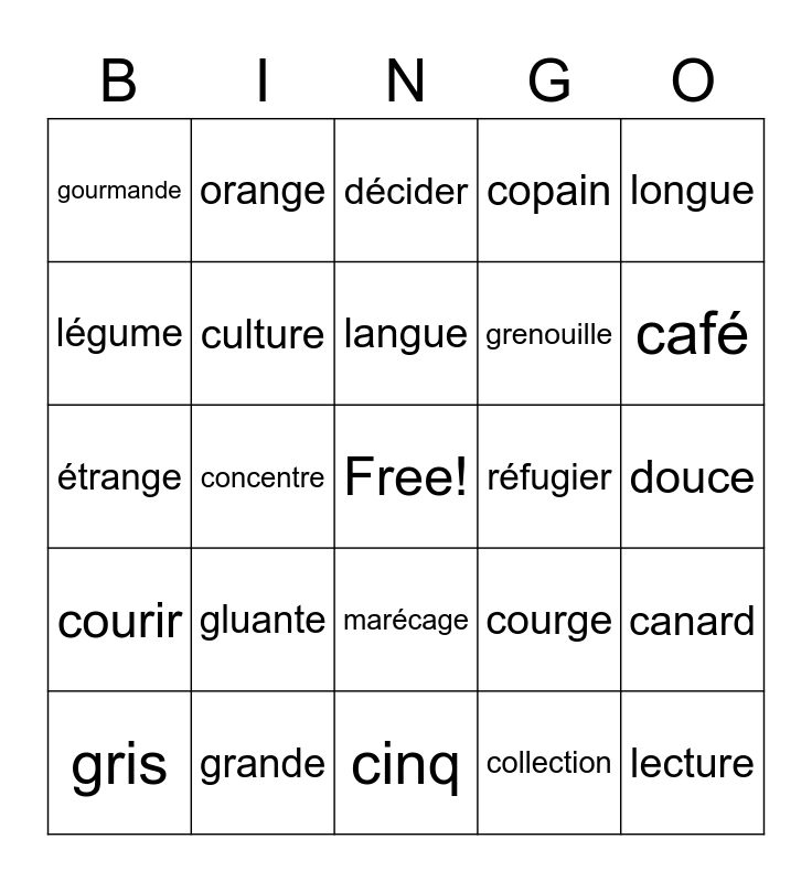 This bingo card has a free space and 24 words: gluante, grande, langue, gris, longue, gourmande, légume, orange, réfugier, marécage, grenouille, étrange, courge, canard, culture, collection, douce, décider, café, concentre, lecture, courir, copain and cinq.