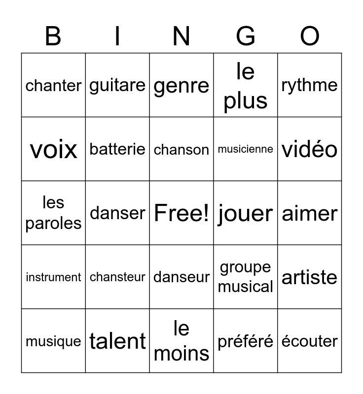 This bingo card has a free space and 24 words: chansteur, talent, chanson, musique, rythme, chanter, voix, guitare, jouer, danseur, musicienne, les paroles, groupe musical, artiste, batterie, préféré, aimer, genre, vidéo, danser, écouter, instrument, le plus and le moins.
