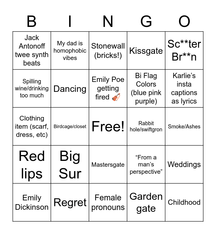 This bingo card has a free space and 27 words: “From a man’s perspective”, Gold, Bi Flag Colors (blue pink purple), Female pronouns, Spilling wine/drinking too much, Stonewall (bricks!), My dad is homophobic vibes, Red lips, Rabbit hole/swiftgron, Weddings, Clothing item (scarf, dress, etc), Kissgate, Emily Dickinson, Regret, Karlie’s insta captions as lyrics, Revenge, Dancing, Emily Poe getting fired 🎻, Big Sur, Jack Antonoff twee synth beats, Smoke/Ashes, Garden gate, Birdcage/closet, Childhood, Mastersgate, Sc**ter Br**n and Comparing Hollywood to high school.