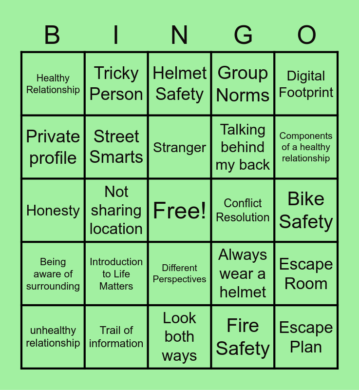 This bingo card has a free space and 24 words: unhealthy relationship, Introduction to Life Matters, Stranger, Fire Safety, Digital Footprint, Healthy Relationship, Tricky Person, Helmet Safety, Conflict Resolution, Bike Safety, Honesty, Street Smarts, Always wear a helmet, Escape Room, Private profile, Trail of information, Look both ways, Group Norms, Components of a healthy relationship, Being aware of surrounding, Not sharing location, Different Perspectives, Talking behind my back and Escape Plan.