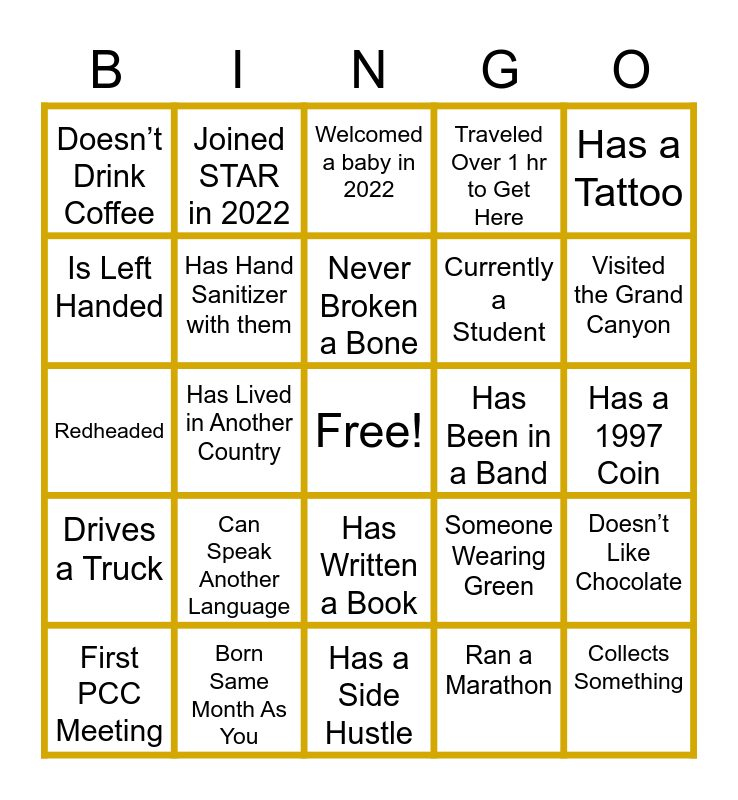 This bingo card has a free space and 24 words: Can Speak Another Language, Born Same Month As You, Never Broken a Bone, First PCC Meeting, Has a Tattoo, Doesn’t Drink Coffee, Is Left Handed, Joined STAR in 2022, Has Been in a Band, Has Written a Book, Currently a Student, Redheaded, Someone Wearing Green, Doesn’t Like Chocolate, Has Hand Sanitizer with them, Ran a Marathon, Has a 1997 Coin, Welcomed a baby in 2022, Visited the Grand Canyon, Has Lived in Another Country, Collects Something, Drives a Truck, Traveled Over 1 hr to Get Here and Has a Side Hustle.