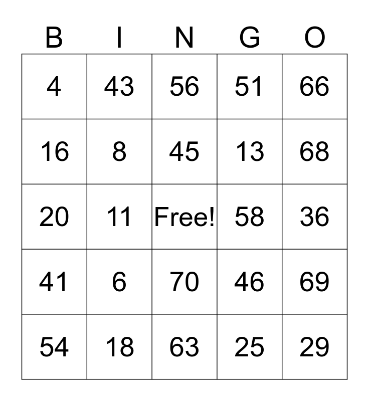 This bingo card has a free space and 24 words: 6, 18, 45, 54, 66, 4, 16, 43, 58, 70, 13, 20, 46, 69, 8, 25, 36, 56, 68, 11, 29, 41, 51 and 63.