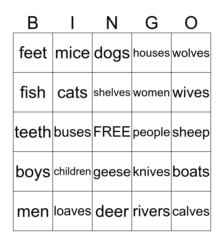 This bingo card has a free space and 24 words: children, loaves, shelves, men, wolves, feet, fish, mice, people, geese, women, teeth, knives, boats, cats, rivers, sheep, dogs, wives, buses, calves, boys, houses and deer.