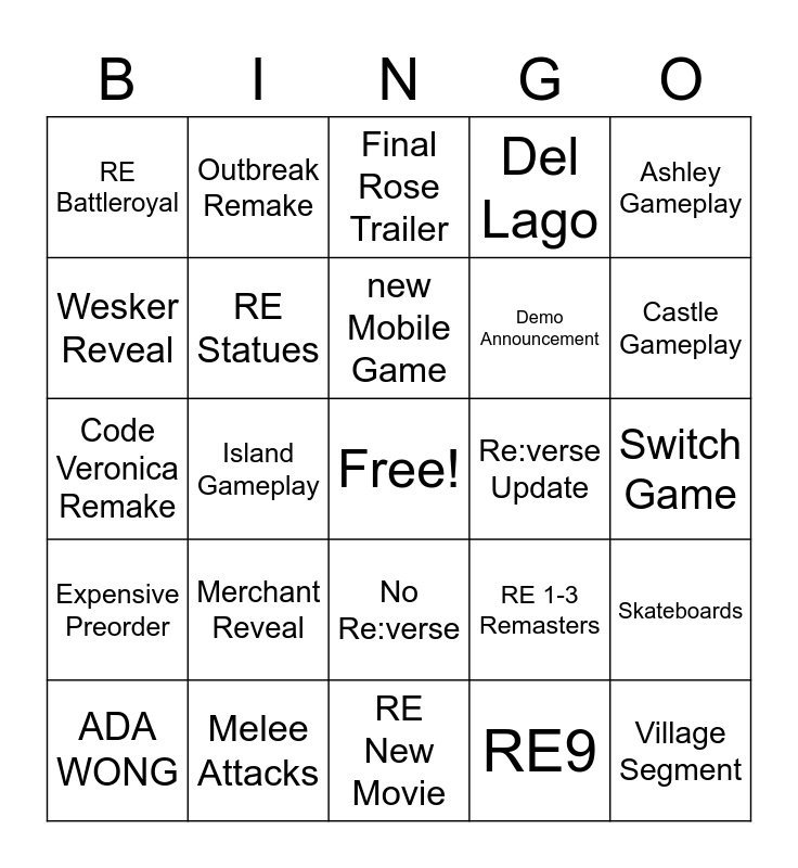 This bingo card has a free space and 24 words: Merchant Reveal, Melee Attacks, new Mobile Game, ADA WONG, Ashley Gameplay, RE Battleroyal, Wesker Reveal, Outbreak Remake, Re:verse Update, No Re:verse, Demo Announcement, Code Veronica Remake, RE 1-3 Remasters, Skateboards, RE Statues, RE9, Switch Game, Final Rose Trailer, Castle Gameplay, Island Gameplay, Village Segment, Expensive Preorder, Del Lago and RE New Movie.