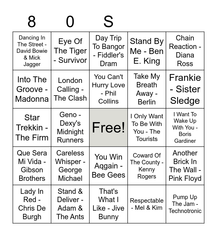 This bingo card has a free space and 90 words: I Think We're Alone Now - Tiffany, All Night Long - Lionel Ritchie, You Win Aqgain - Bee Gees, Pump Up The Volume - MARRS, A Good Heart - Feargal Sharkey, Down Under - Men At Work, The Power Of Love - Jennifer Rush, Living Doll - The Young Ones, Fame - Irene Cara, Brass In Pocket - The Pretenders, Shaddup Your face - Joe Dolce, He Ain't Heavy - The Hollies, Vienna - Ultravox, I Want To Wake Up With You - Boris Gardiner, This Ole House - Shakin Stevens, You Can't Hurry Love - Phil Collins, Agadoo - Black Lace, Eternal Flame - The Bangles, 19 - Paul Hardcastle, Do You really Want To Hurt Me - Culture Club, Feels Like I'm In Love - Kelly Marie, Tears Of A Clown - The Beat, That's What I Like - Jive Bunny, Woman In Love - Barbara Streisand, Star Trekkin - The Firm, Stand & Deliver - Adam & The Ants, Nothing's Gonna Change My Love For You - Glen Mederos, I Should Be So Lucky - Kylie Minogue, So Macho - Sinita, Just Like Starting Over - John Lennon, Somethings Gotten Hold Of My Heart - Marc Almond & Gene Pitney, Another Brick In The Wall - Pink Floyd, Crazy Little Thing Called Love - Queen, Que Sera Mi Vida - Gibson Brothers, Dancing In The Street - David Bowie & Mick Jagger, Stand By Me - Ben E. King, Day Trip To Bangor - Fiddler's Dram, Ride On Time - Black Box, Geno - Dexy's Midnight Runners, Frankie - Sister Sledge, Lady In Red - Chris De Burgh, Into The Groove - Madonna, Don't Leave Me This Way - The Communards, Total Eclipse Of The Heart - Bonnie Tyler, Birdie Song - The Tweets, Coward Of The County - Kenny Rogers, Don't Stand So Close To Me - The Police, Last Train To London - ELO, Move Closer - Phyllis Nelson, Let's Dance - David Bowie, Is It Love You're Afterv - Rose Royce, Take My Breath Away - Berlin, Rockabilly Rebel - Matchbox, Making Your Mind Up - Bucks Fizz, Tainted Love - Soft Cell, I Want To Know What Love Is - Foreigner, I Only Want To Be With You - The Tourists, The Only Way Is Up - Yazz, Do They Know It's Christmas - Band Aid, China In Your Hand - T'Pau, Take On Me - A-Ha, I Just Called To Say I Love You - Stevie Wonder, The Tide Is High - Blondie, Uptown Girl - Billy Joel, Back To Life - Soul II To Soul, One Step Beyond - Madness, D.I.S.C.O. - Ottawan, Respectable - Mel & Kim, Never Gonna Give You Up - Rick Astley, Everything She Wants - Wham, Careless Whisper - George Michael, Pump Up The Jam - Technotronic, One Day In Your Life - Michael Jackson, Ghostbusters - Ray Parker Junior, Eye Of The Tiger - Survivor, London Calling - The Clash, Together We Are Beautiful - Fern Kinney, Red Red Wine - UB40, Teardrops - Womack & Womack, Every Loser Wins - Nick Berry, Working For The Yankee Dollar - Skids, Chain Reaction - Diana Ross, True - Spandau Ballet, With A Little Help From My Friends - Wet Wet Wet, I Want To Dance With Somebody - Whitney Houston, Super Trooper - ABBA, It's A Sin - Pet Shop Boys, Relax - Frankie Goes To Hollywood, Nothing's Gonna Stop Us Now - Starship and When The Going Gets Tough - Billy Ocdean.