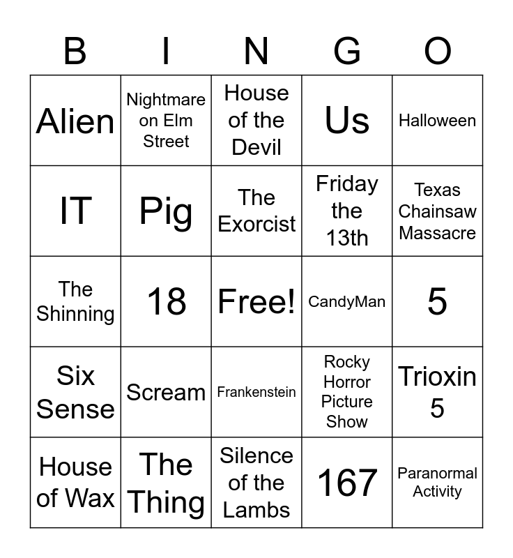 This bingo card has a free space and 24 words: Scream, The Thing, The Exorcist, House of Wax, Halloween, Alien, IT, Nightmare on Elm Street, CandyMan, Frankenstein, Friday the 13th, The Shinning, Rocky Horror Picture Show, Trioxin 5, Pig, 167, 5, House of the Devil, Texas Chainsaw Massacre, 18, Paranormal Activity, Six Sense, Us and Silence of the Lambs.