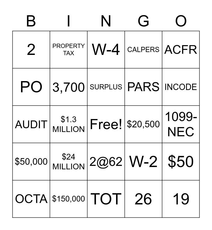 This bingo card has a free space and 24 words: OCTA, $24 MILLION, SURPLUS, 26, ACFR, 2, PROPERTY TAX, W-4, $20,500, 1099-NEC, AUDIT, 3,700, W-2, $50, PO, $150,000, TOT, CALPERS, INCODE, $50,000, $1.3 MILLION, 2@62, PARS and 19.