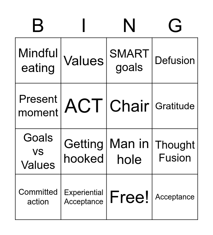 This bingo card has 17 words: Free!, Committed action, SMART goals, Mindful eating, Getting hooked, Defusion, Thought Fusion, Chair, Gratitude, ACT, Experiential Acceptance, Man in hole, Present moment, Values, Goals vs Values, Avoidance and Acceptance.