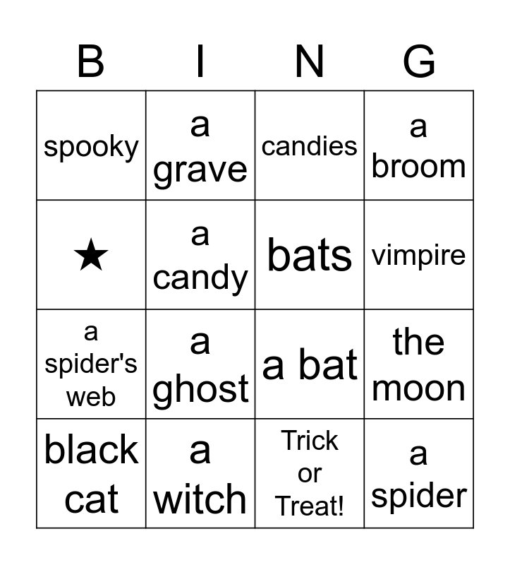 This bingo card has 16 words: a witch, the moon, candies, spooky, a spider's web, a grave, a bat, Trick or Treat!, ★, a candy, black cat, a broom, a ghost, vimpire, bats and a spider.