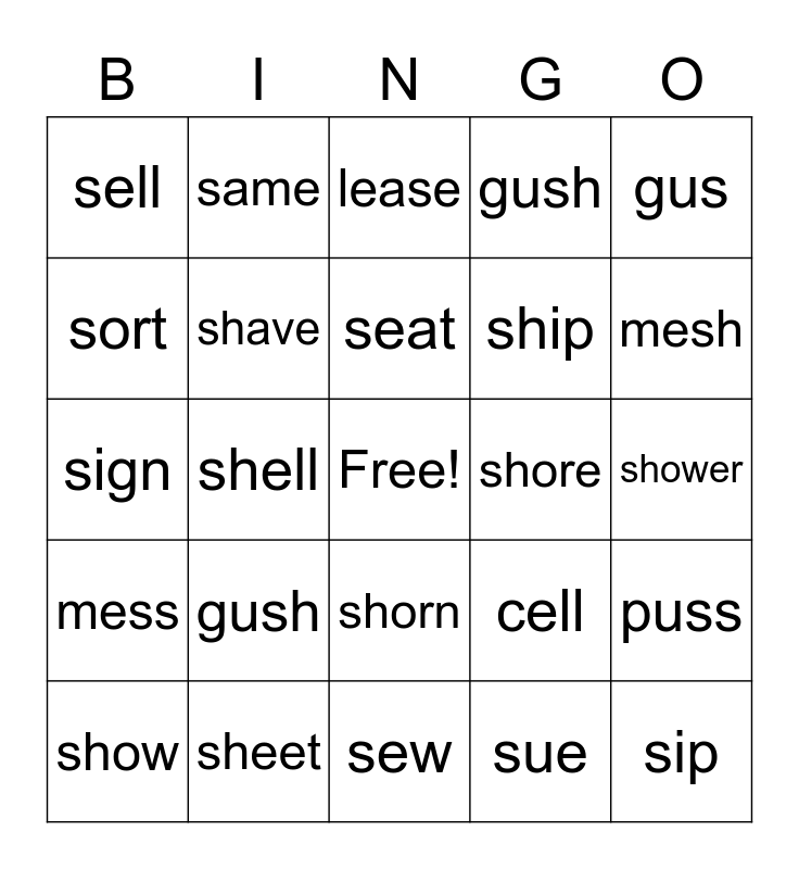 This bingo card has a free space and 24 words: show, gush, seat, sue, gus, sell, same, lease, shore, shower, sign, shave, cell, puss, sort, sheet, sew, gush, mesh, mess, shell, shorn, ship and sip.
