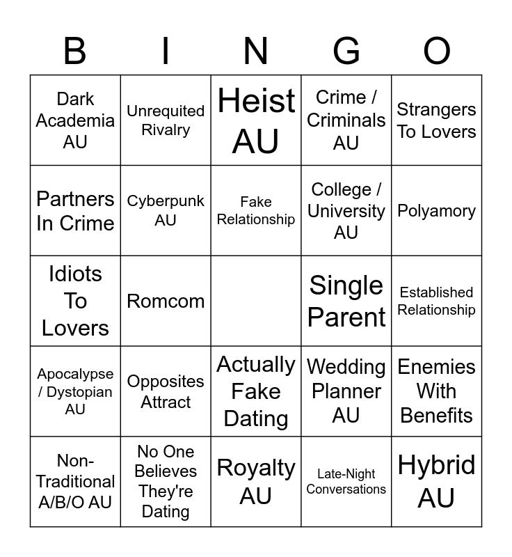 This bingo card has a free space and 86 words: 3+1 / 5+1 Things, Acts Of Service, Actually Fake Dating, Angst With A Happy Ending, Bad Flirting, Banter / Bickering, Based On Other Media, Character Study, Childhood Friends, Childhood Friends To Lovers, Confessions, Domesticity, Enemies With Benefits, Established Relationship, Exes To Lovers, Fake Relationship, Found Family, Friends To Lovers, Friends With Benefits, Happy Ending, Humor, Hurt/Comfort, Idiots To Lovers, Jealousy, Late-Night Conversations, Love Languages, Marriage Of Convenience, Meddling / Matchmaking, Morally Gray Characters, Mutual Pining, No One Believes They're Dating, Non-Linear Narrative, Only One Bed, Opposites Attract, Partners In Crime, Pining, Polyamory, Practice Kissing, Professional Partners To Lovers, Romcom, Roommates, Secret Relationship, Sharing Dreams, Single Parent, Slice Of Life, Strangers To Lovers, Stuck Together / Forced Proximity, Unrequited Rivalry, Very Obvious A Very Oblivious B, We Kissed Once But We Don't Talk About It, Wound Tending, Angels and Demons AU, Apocalypse / Dystopian AU, Bakery AU, Boarding School AU, Canon Divergent AU, Coffee Shop AU, College / University AU, Crime / Criminals AU, Cyberpunk AU, Dark Academia AU, Fantasy AU, Florist x Tattoo Artist AU, Folklore / Mythology AU, Fraternity AU, Heist AU, Hospital AU, Hybrid AU, Lawyers AU, Magical AU, Modern With Magic AU, Non-Idol Celebrity AU, Non-Traditional A/B/O AU, Office AU, Omegaverse AU, Rockstar / Band AU, Royalty AU, Science Fiction AU, Sports AU, Spy AU, Sugar Baby AU, Superpowers / Superhero AU, Urban Fantasy AU, Vampire AU, Wedding Planner AU and Werewolf / Shapeshifter AU.