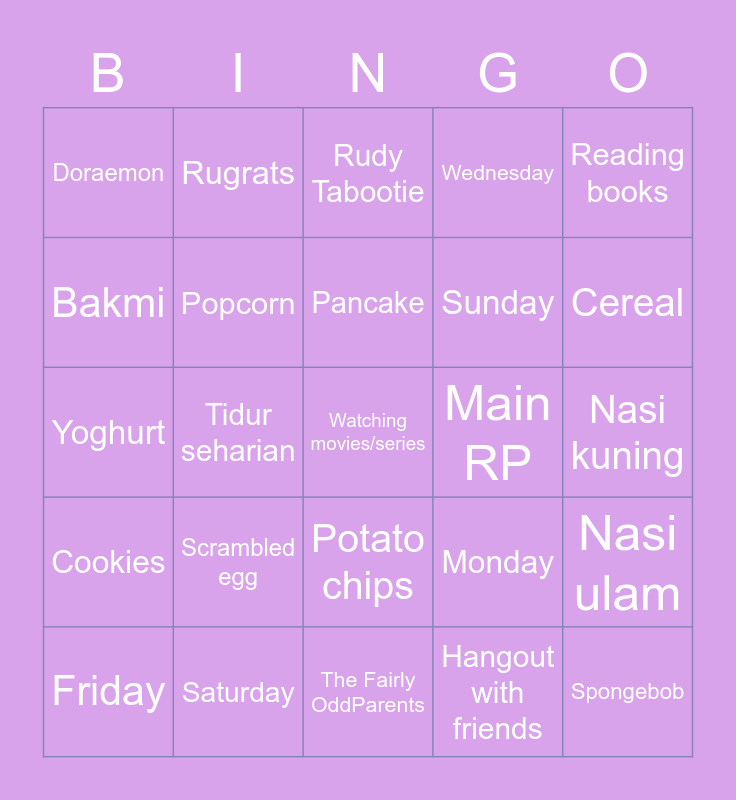 This bingo card has a free space and 24 words: Scrambled egg, Saturday, Pancake, Friday, Reading books, Doraemon, Bakmi, Rugrats, Main RP, Potato chips, Sunday, Yoghurt, Monday, Nasi ulam, Popcorn, Hangout with friends, Nasi kuning, Rudy Tabootie, Cereal, Tidur seharian, Spongebob, Cookies, Wednesday and The Fairly OddParents.