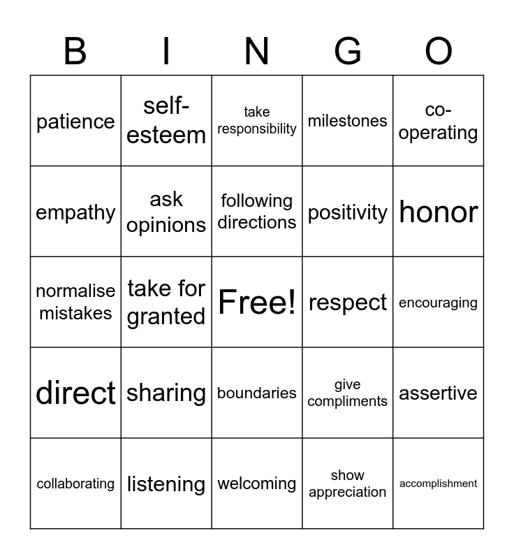 This bingo card has a free space and 24 words: sharing, listening, following directions, collaborating, co-operating, patience, empathy, self-esteem, respect, boundaries, positivity, normalise mistakes, give compliments, assertive, ask opinions, show appreciation, encouraging, take responsibility, honor, take for granted, accomplishment, direct, milestones and welcoming.