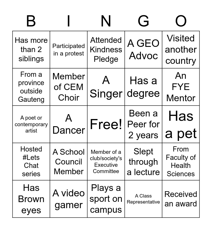This bingo card has a free space and 24 words: A School Council Member, A video gamer, A Singer, Has Brown eyes, Visited another country, Has more than 2 siblings, From a province outside Gauteng, Participated in a protest, Been a Peer for 2 years, Member of a club/society's Executive Committee, Has a degree, A poet or contemporary artist, Slept through a lecture, From Faculty of Health Sciences, Member of CEM Choir, A Class Representative, Has a pet, Attended Kindness Pledge, An FYE Mentor, A Dancer, Received an award, Hosted #Lets Chat series, A GEO Advoc and Plays a sport on campus.