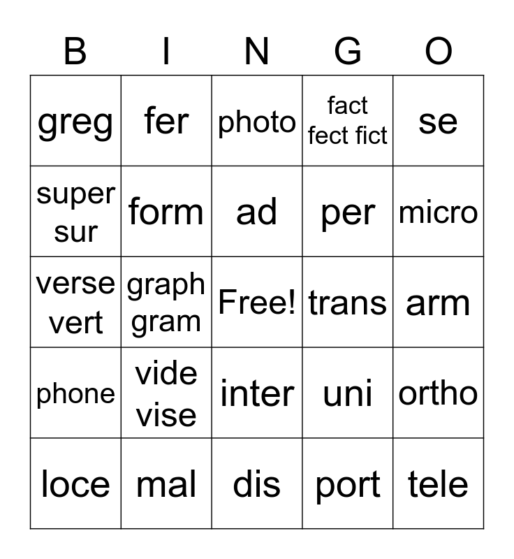 This bingo card has a free space and 24 words: vide vise, mal, ad, loce, se, greg, super sur, fer, trans, inter, per, verse vert, uni, ortho, form, port, arm, photo, micro, graph gram, tele, phone, fact fect fict and dis.
