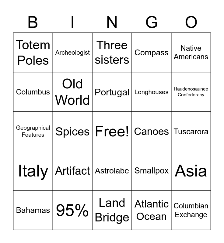 This bingo card has a free space and 35 words: Colony, Europe, New World, Old World, Astrolabe, Compass, Columbus, Spain, Portugal, Nina, Pinta, Santa Maria, Geographical Features, Native Americans, Eastern Woodlands, Desert, Totem Poles, Canoes, Atlantic Ocean, Spices, Italy, Columbian Exchange, Smallpox, Bahamas, Asia, 95%, Three sisters, Haudenosaunee Confederacy, Hiawatha Belt, Wampum, Longhouses, Tuscarora, Soil, Land Bridge, Artifact, Archeologist and Nomad.