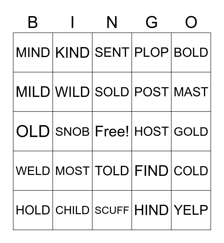 This bingo card has a free space and 24 words: MOST, CHILD, SOLD, HOLD, BOLD, MIND, MILD, KIND, HOST, TOLD, POST, OLD, FIND, COLD, WILD, HIND, GOLD, SENT, MAST, SNOB, YELP, WELD, PLOP and SCUFF.