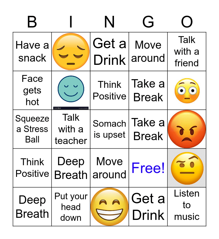 This bingo card has 6 images and 19 words: Deep Breath, Think Positive, Deep Breath, Talk with a friend, Have a snack, Face gets hot, Take a Break, Move around, Take a Break, Squeeze a Stress Ball, Free!, Listen to music, Get a Drink, Talk with a teacher, Somach is upset, Put your head down, Think Positive, Move around and Get a Drink.