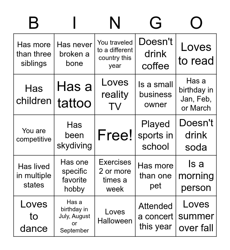 This bingo card has a free space and 49 words: Afraid of heights, Loves summer over fall, Is left handed, Loves Halloween, Has one specific favorite hobby, Hates spicy food, Has never broken a bone, Has a birthday in April, May or June, Has children, Plays a musical instrument, Has a tattoo, Doesn't drink coffee, Is a morning person, Has more than one pet, Could eat sushi everyday, Speaks more than one language, Loves reality TV, Played sports in school, Has traveled to Europe, Loves to read, Has been skydiving, Attended a concert this year, Has more than three siblings, Is a small business owner, Loves the fall over summer, Has a birthday in Jan, Feb, or March, Loves to dance, Has a birthday in October, September or December, Exercises 2 or more times a week, Has lived in multiple states, Wants to move out of Maryland, Has never gotten a speeding ticket, Has a lot of plants at home, Is a night owl, Has a birthday in July, August or September, Is into nature, Has worked in the restaurant industry, Has worked in the retail industry, Doesn't drink soda, Has won more than $100 at a casino, Loves water sports, Loves crime shows/tv, Wings over pizza, You like to clean, You are competitive, You traveled to a different country this year, Your the funny one in your friend group, You like rollercoasters and You like being out better then being home.