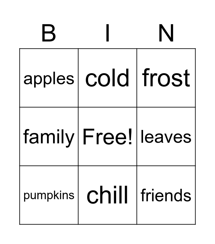 This bingo card has a free space and 8 words: leaves, frost, cold, pumpkins, apples, friends, family and chill.